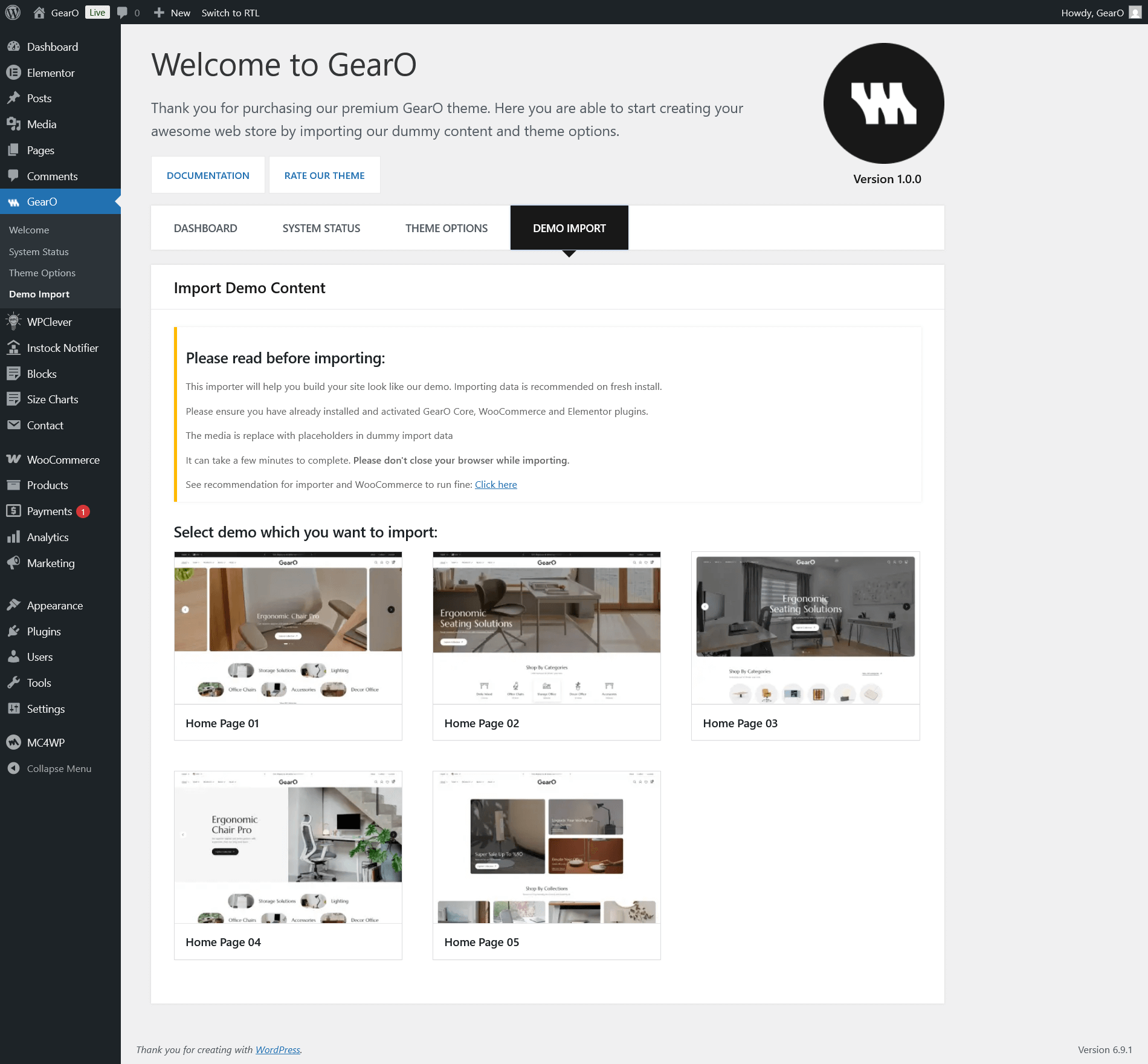 Thank you for purchasing GearO – Luxury Furniture Store WooCommerce WordPress Theme! In this document you will find information on how to install, manage and update your theme, as well as create content, install plugins, import Demo data etc. If you have any questions that are beyond the scope of this help file, please feel free to contact us via Support link. We will do our best to answer you in shortest of time.