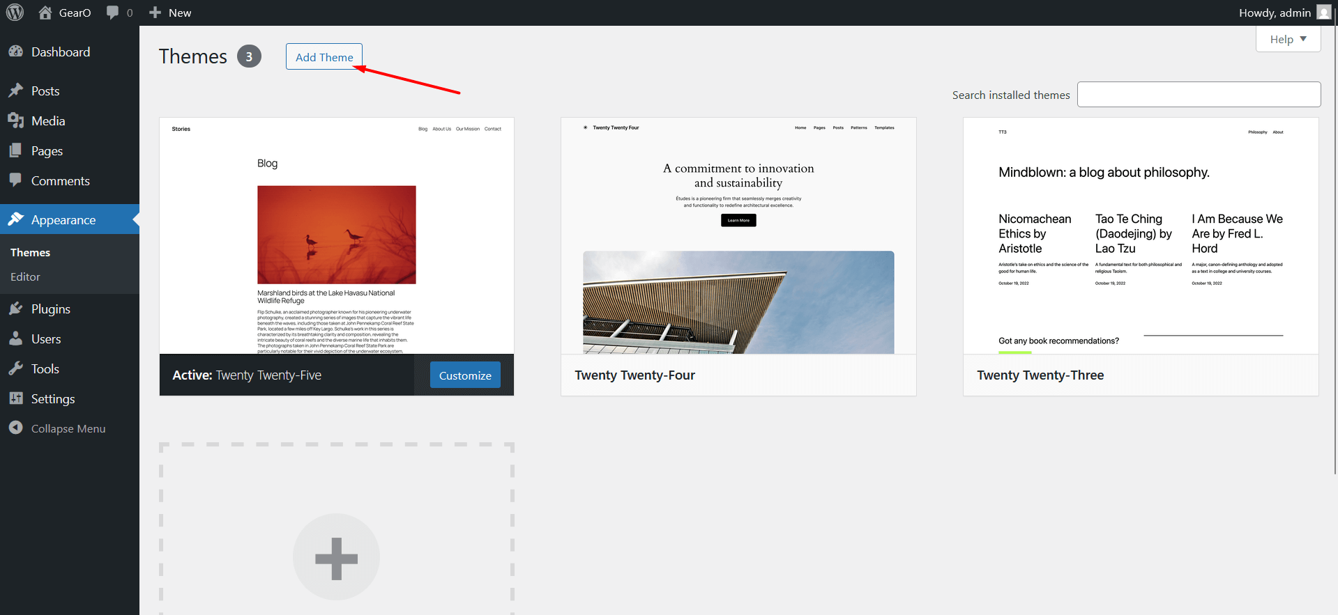 3. Locate your WordPress installation and upload the theme directory gearo (you unzipped in the previous step) into ../wp-content/themes/ in your WordPress installation.
