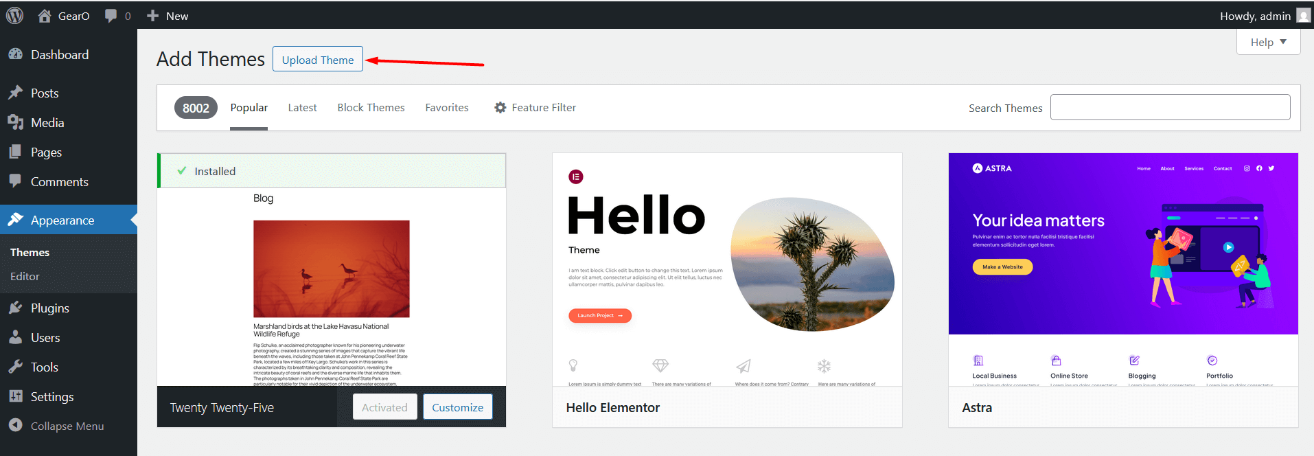 4. Then click Upload Theme