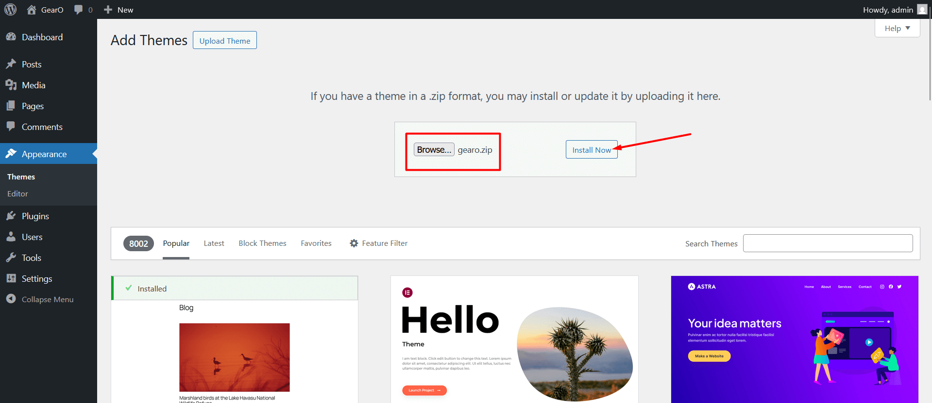 5. Browse to the gearo.zip file and click Install now for the theme to be uploaded and installed.