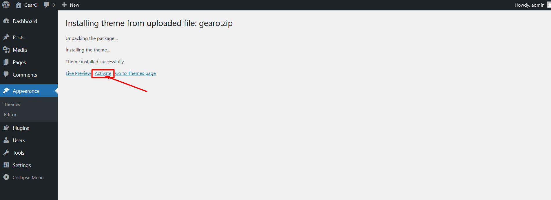 6. After done installing, click Activate the theme
