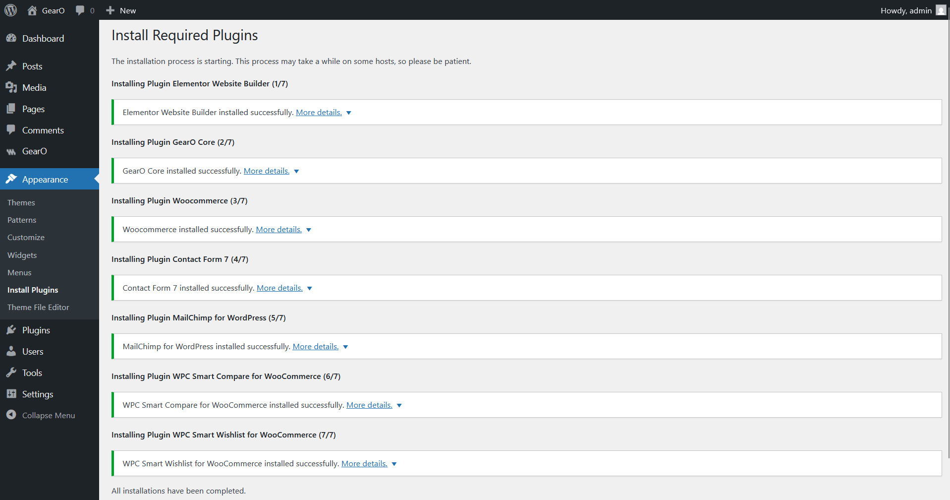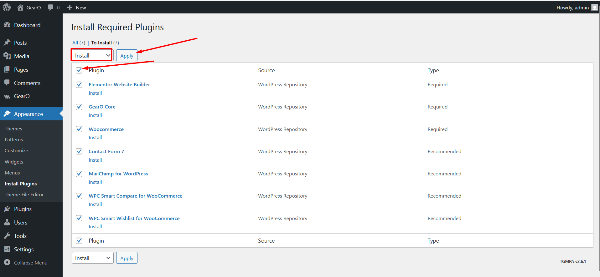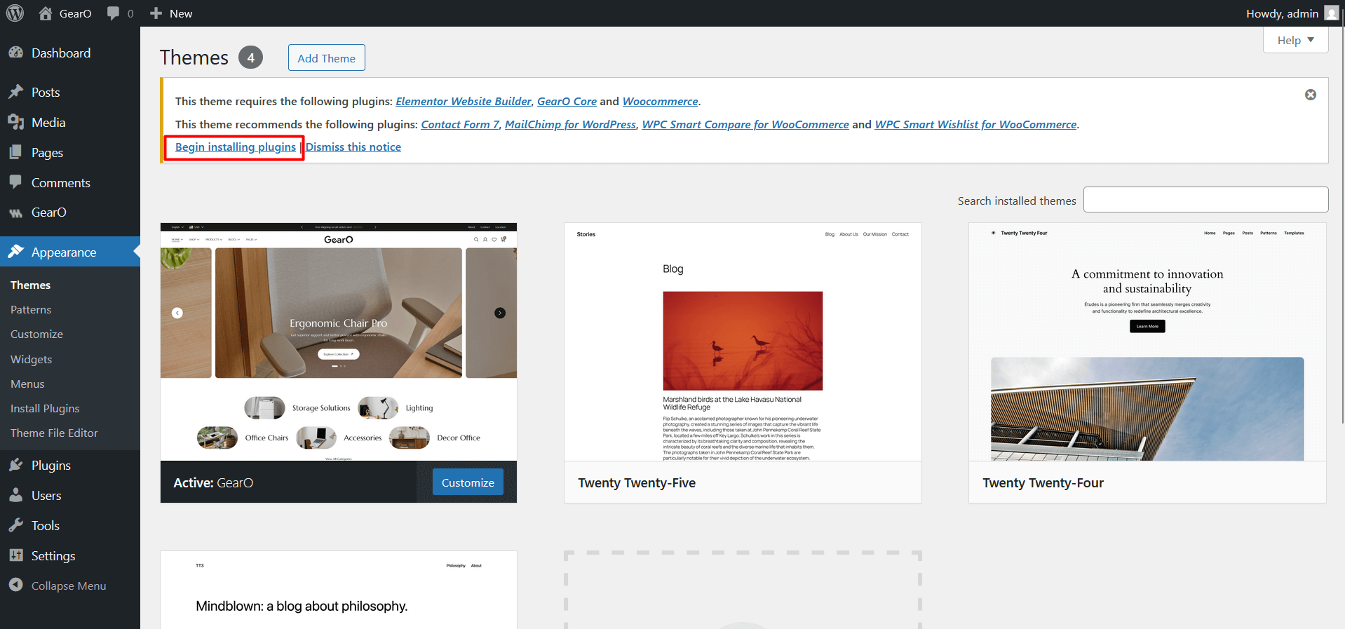 After installing and activate the GearO theme, you'll see a notification in the top of the page that says the theme needs some plugins to function properly.Please, follow the steps below to install required plugins.