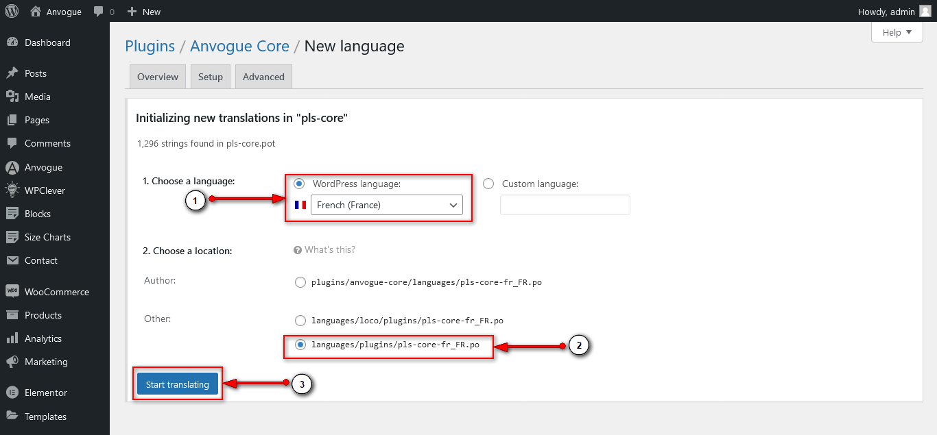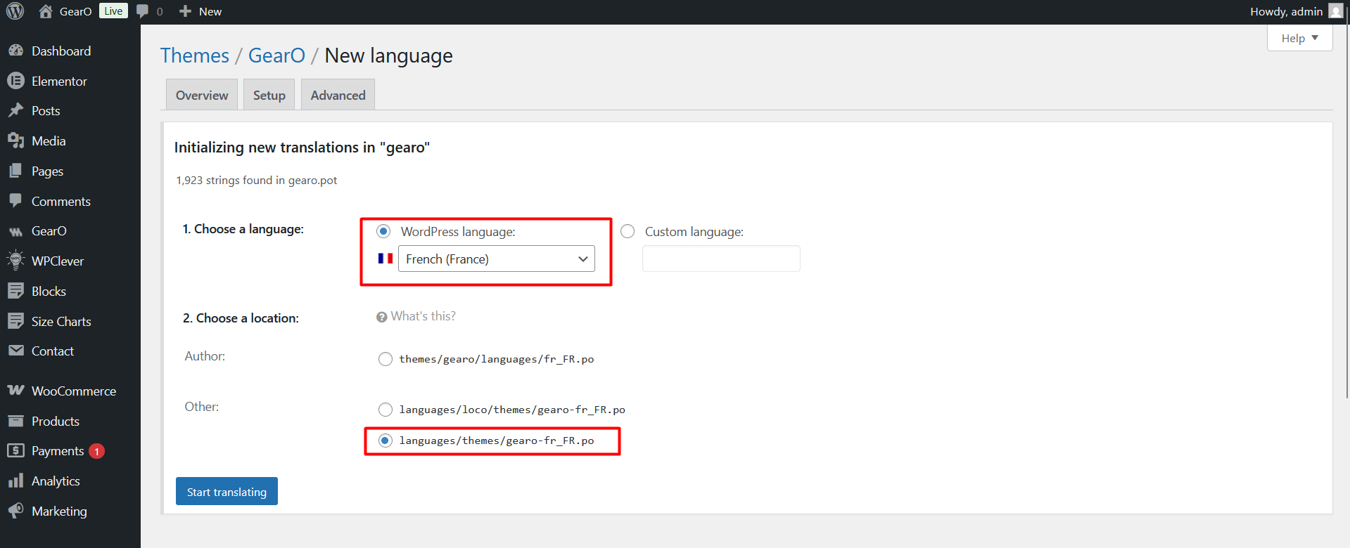 4. Choose your language and choose a location is in languages/themes/. We recommend you don’t choose a location is in themes/gearo/languages/, because after you update the theme all your custom files will be lost.